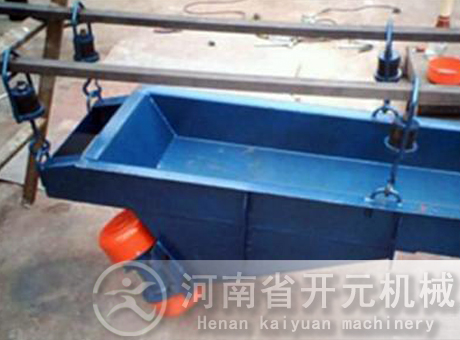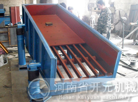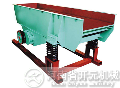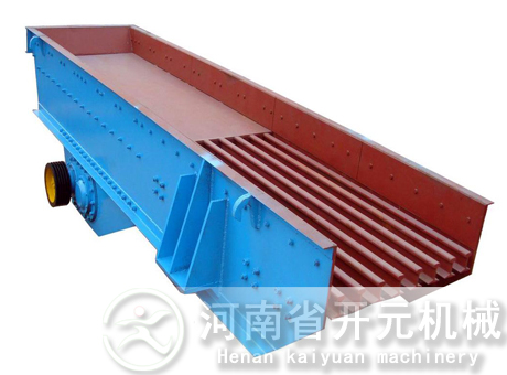 槽式給料機又稱往復式或擺動式給料機,它是貯礦槽排料應用較早的一種給料設備。型式較多,其結構的共同點是均裝有可控制料層高度的調節閘板;在輸料槽下部為一前后移動的給料板。其不同點是給料板角度不一樣,一般為沿卸料方向向下傾斜5度以及更大的傾角(小于物料的靜堆積角)和角度為零的水平型等。給料板的動作有前后往復移動式,抖動式以及擺動式等。傳動機構均為曲柄回轉式。