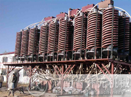 將螺旋溜槽通過螺旋支架立起,校準垂直線,用鐵架固定在合適的位置,由砂泵將礦砂送到螺旋上頂兩個進料口處,加入補充水,調節礦槳濃度,礦槳自然從高往下旋流,在旋轉的斜面流速中產生一種慣性的離心力,以礦砂的比重、粒度、形狀上的差異,通過旋流的重力和離心力的作用,將礦與砂分開,精礦流入精礦斗用管道接出,尾砂流進尾砂斗用管道接到砂池,再用砂泵排走,完成了選礦的全過程