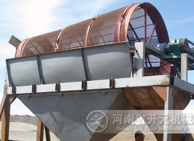 滾筒裝置傾斜安裝于機架上。電動機經減速機與滾筒裝置通過聯軸器連接在一起,驅動滾筒裝置繞其軸線轉動。當物料進入滾筒裝置后,由于滾筒裝置的傾斜與轉動,使篩面上的物料翻轉與滾動,使合格物料(篩下產品)經滾筒后端底部的出料口排出,不合格的物料(篩上產品)經滾筒尾部的排料口排出。由于物料在滾筒內的翻轉、滾動,使卡在篩孔中的物料可被彈出,防止篩孔堵塞。滾筒篩砂機、滾筒篩分機與滾筒篩的原理構造幾乎相同,是人們對它的認識和叫法上存在差異。