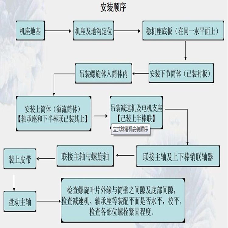 立式螺旋攪拌磨礦機是我公司研制出來用于進行細磨、超細磨的設備,工作效率高,處理量大,具有很多方面的優(yōu)勢,廣泛受到用戶們的認可與青睞。那么該設備對于安裝有哪些方面的要求呢?今天我們就一起來了解下如何正確的安裝該設備。